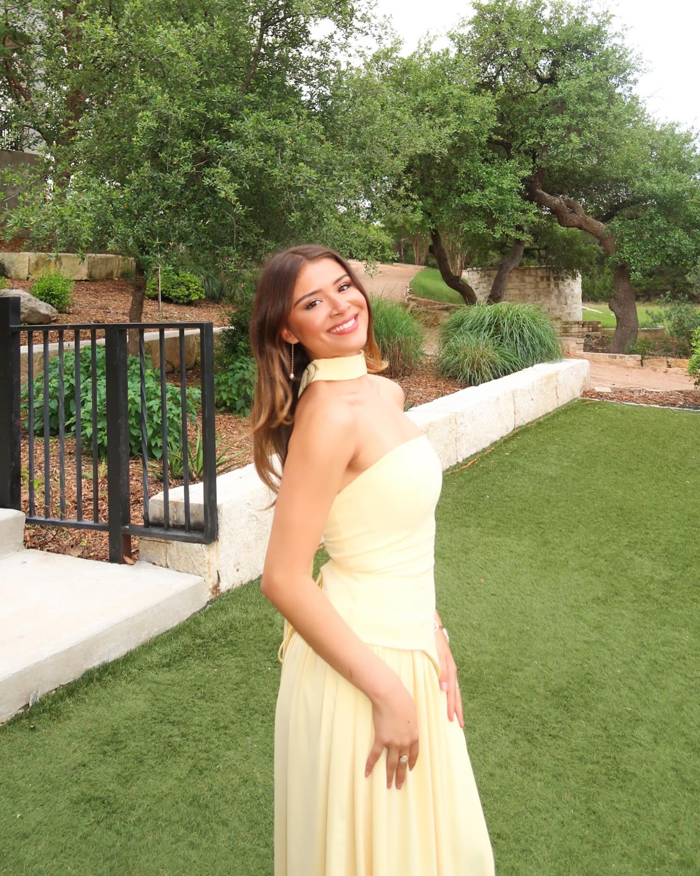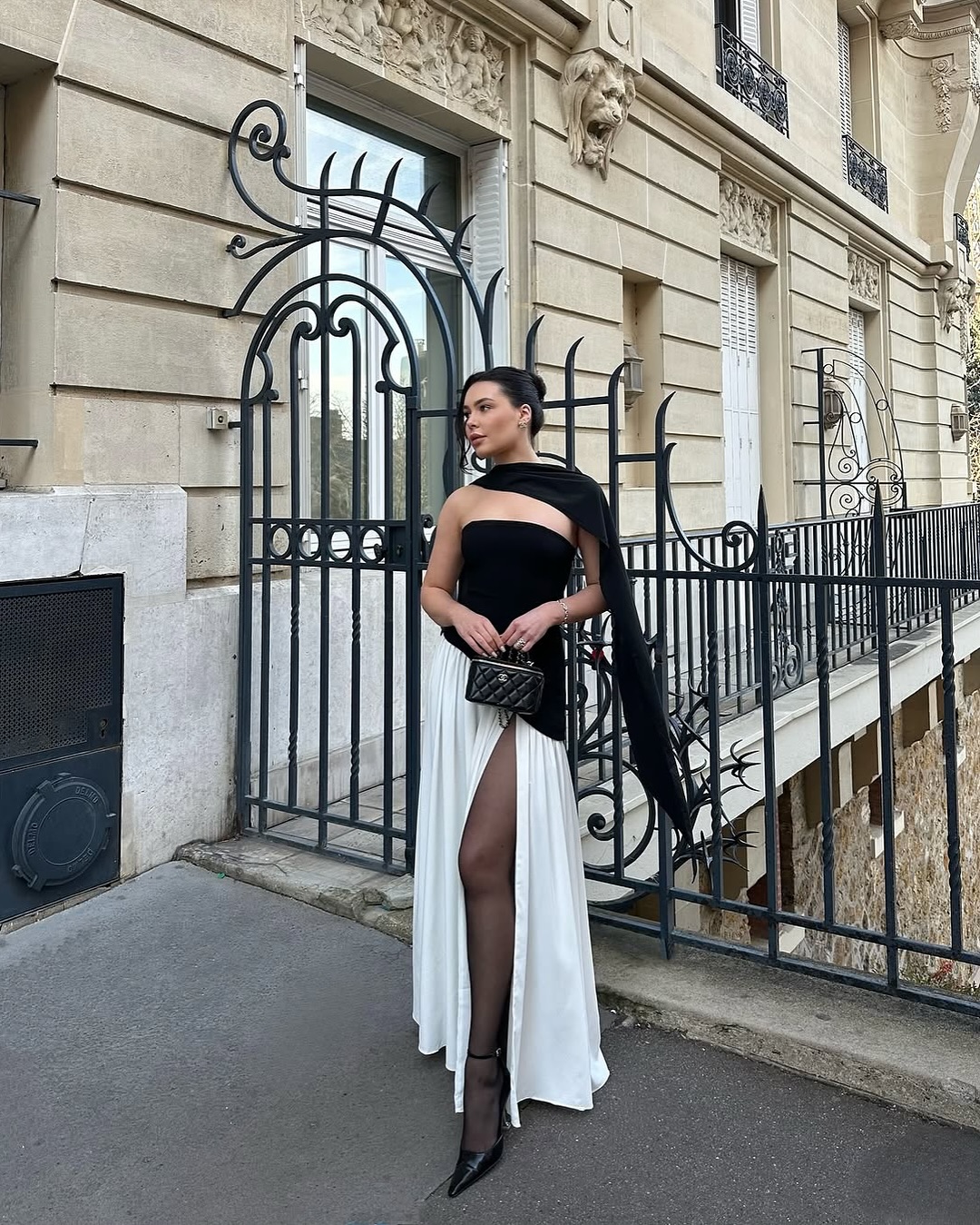 This dress features a non-stretch crepe bodice with a full, gathered chiffon skirt. The dropped waist design and curved asymmetrical hem add a unique touch, while the chiffon scarf adds a playful pop of colour. Don't miss the thigh high split for an extra flirty twist!